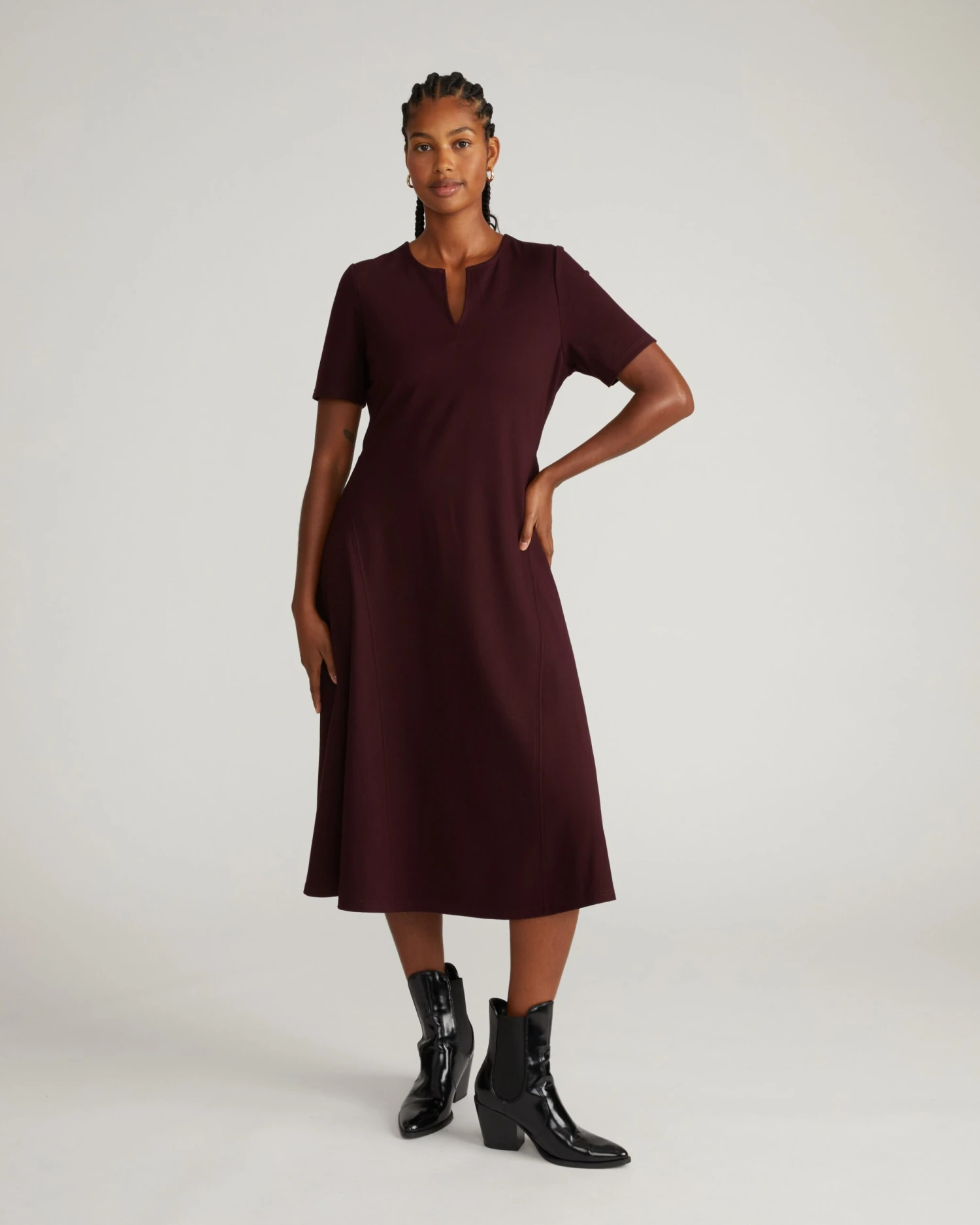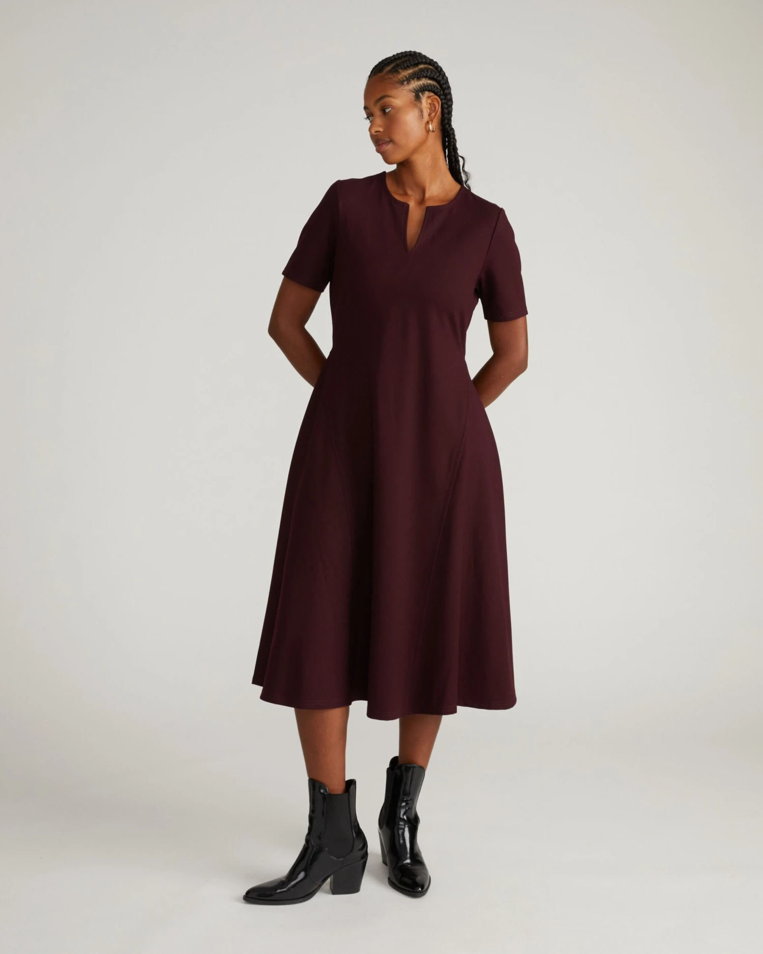 Transition seamlessly from morning meetings to evening events with a dress designed to solve the common office dilemma: choosing between comfort and professional style. The Saskia A-Line Workwear Dress in Black Cherry provides a sophisticated, tailored look with the flexible feel of high-quality stretch fabric, ensuring you stay confident and comfortable throughout your busiest days.