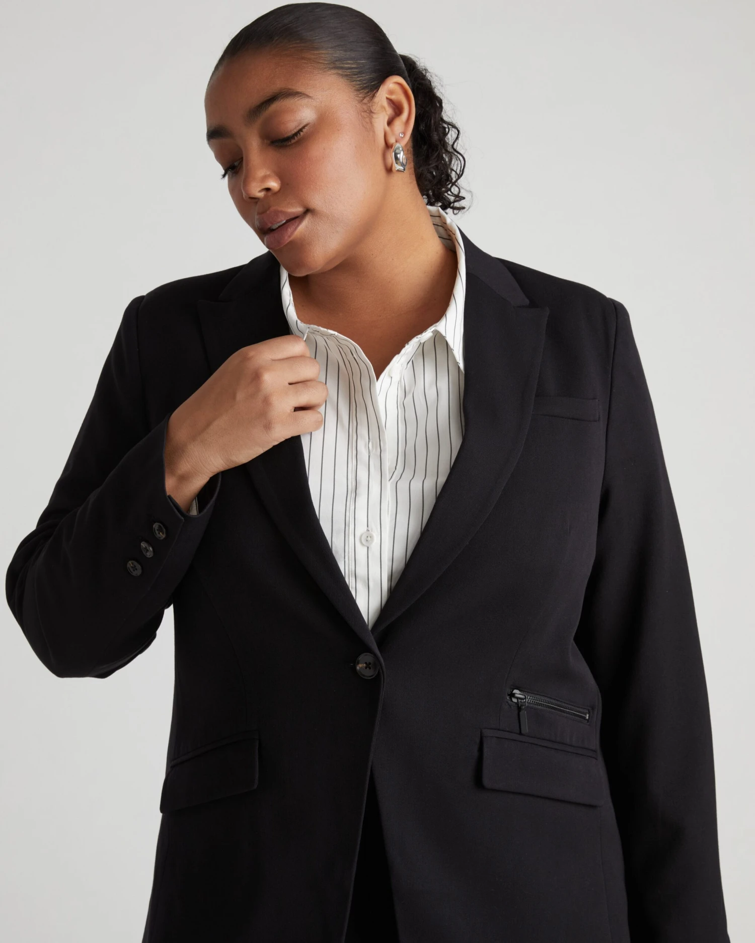This season’s newest addition, the All Day Daria Blazer offers a longer-line silhouette that’s tall-friendly and closely based on the beloved fit of our All Day Classic Blazer. Made from the same stretchy, sustainable suiting fabric, this jacket blends practicality with standout design details: