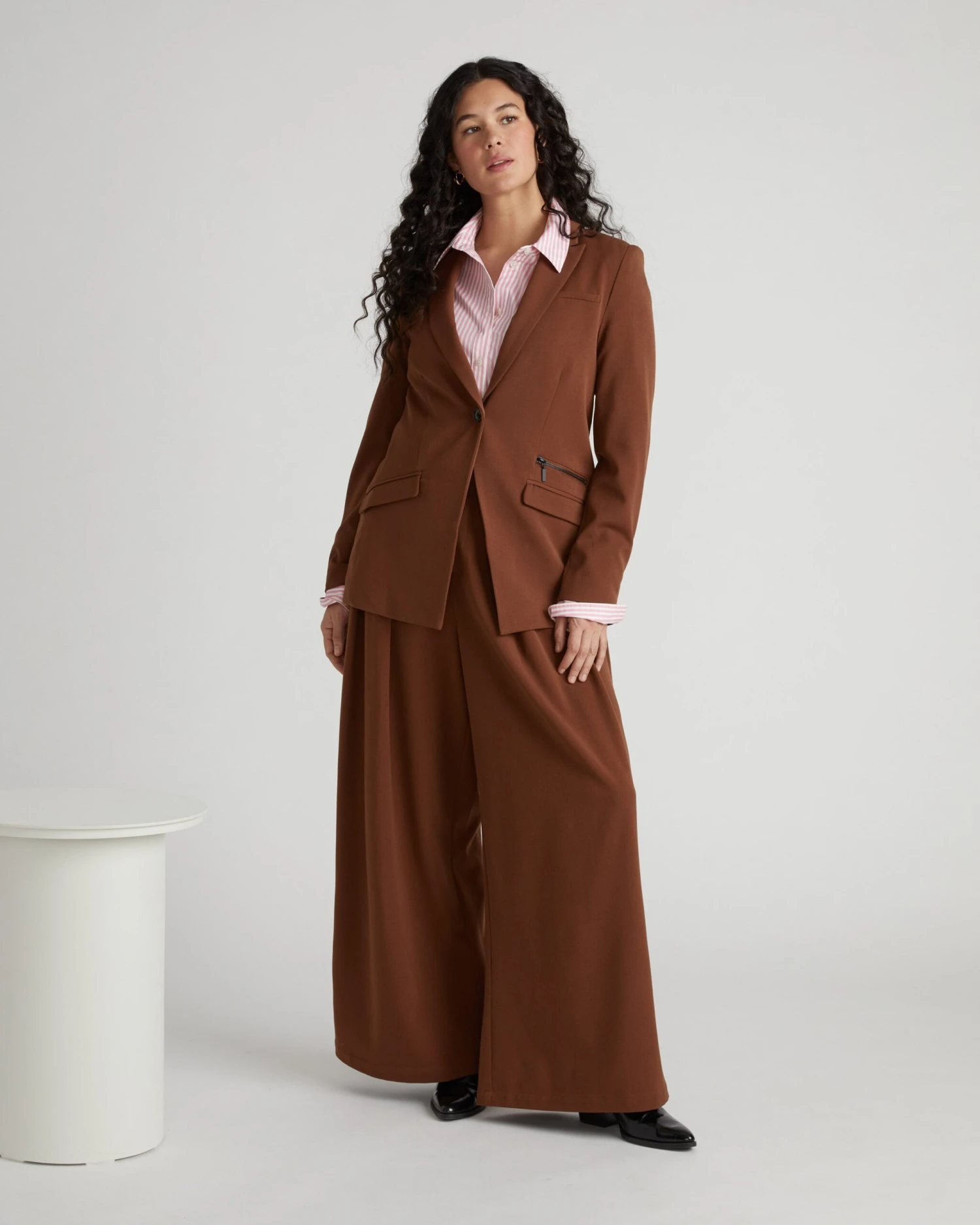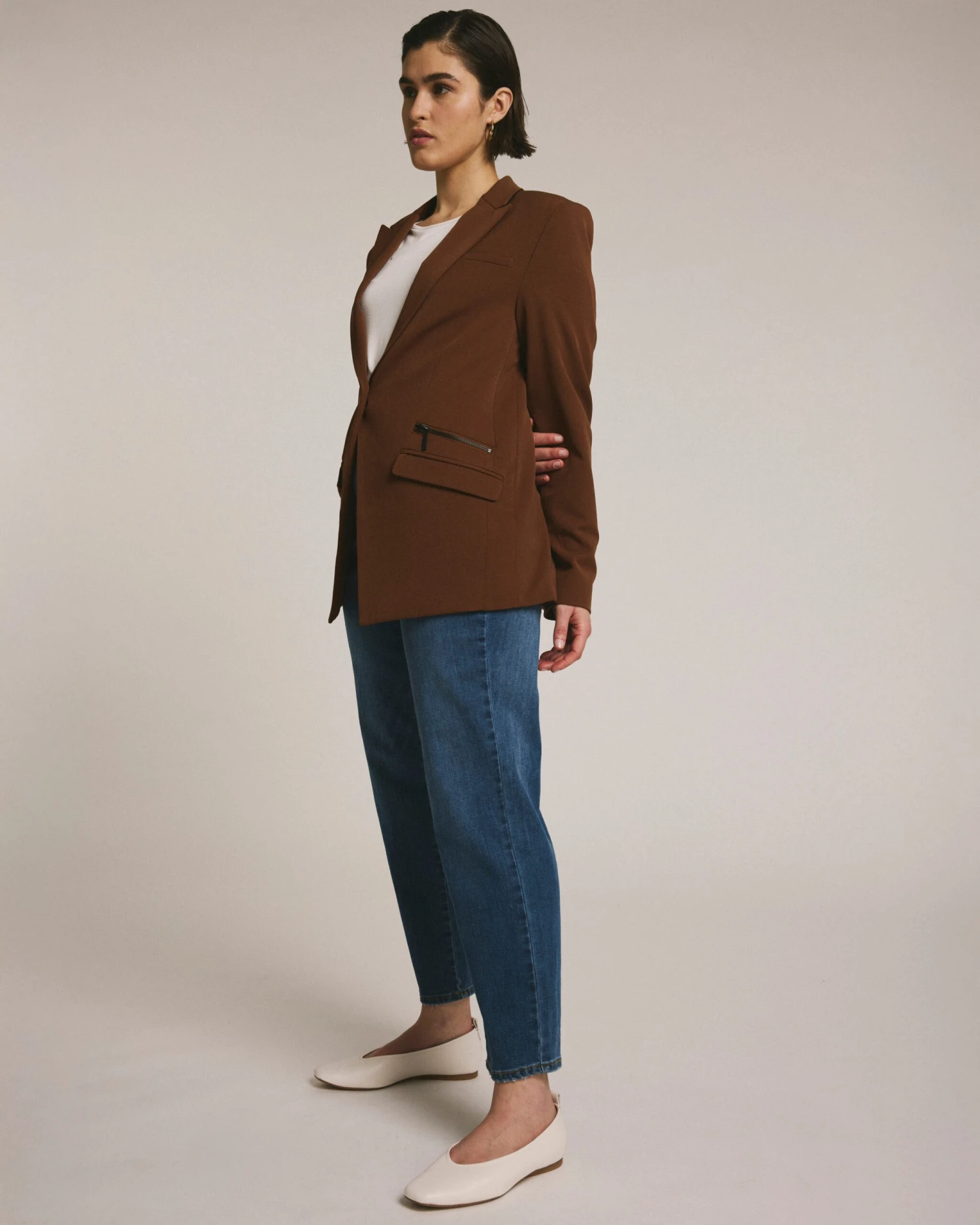 This season’s newest addition, the All Day Daria Blazer offers a longer-line silhouette that’s tall-friendly and closely based on the beloved fit of our All Day Classic Blazer. Made from the same stretchy, sustainable suiting fabric, this jacket blends practicality with standout design details: