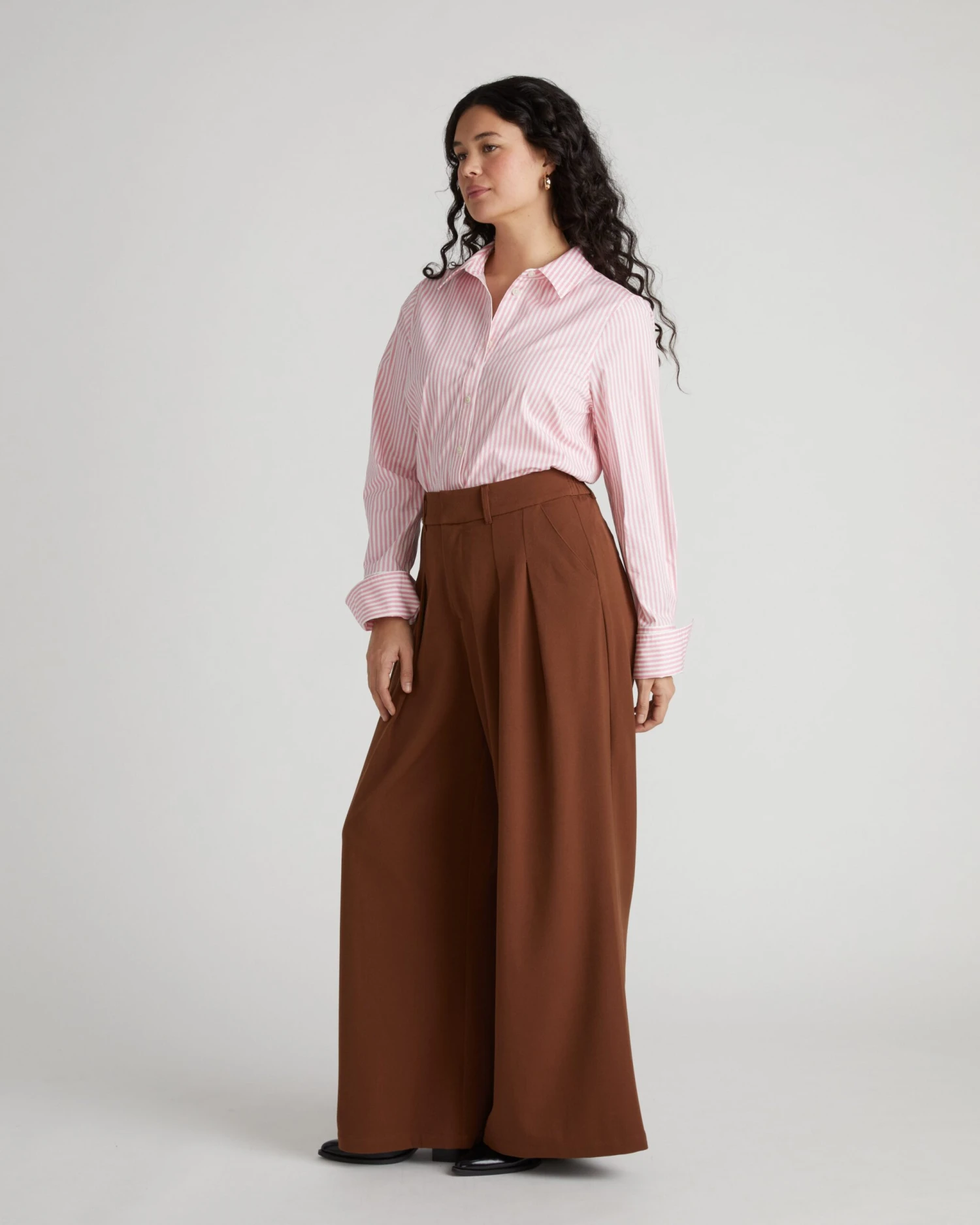Elevate your suiting game with the All Day Wide Leg Pants, the perfect blend of sharp tailoring and everyday comfort. These pants feature stitched down front knife pleats for a sleek silhouette, back darts to enhance the fit, and front slash pockets for practicality. An encased elastic waistband at the back ensures a gap-free fit, while belt loops offer styling versatility. Made from our comfortable, sustainable All Day suiting fabric, this lightweight wide-leg style delivers a powerful yet polished look, pairing effortlessly with any blazer in the collection.