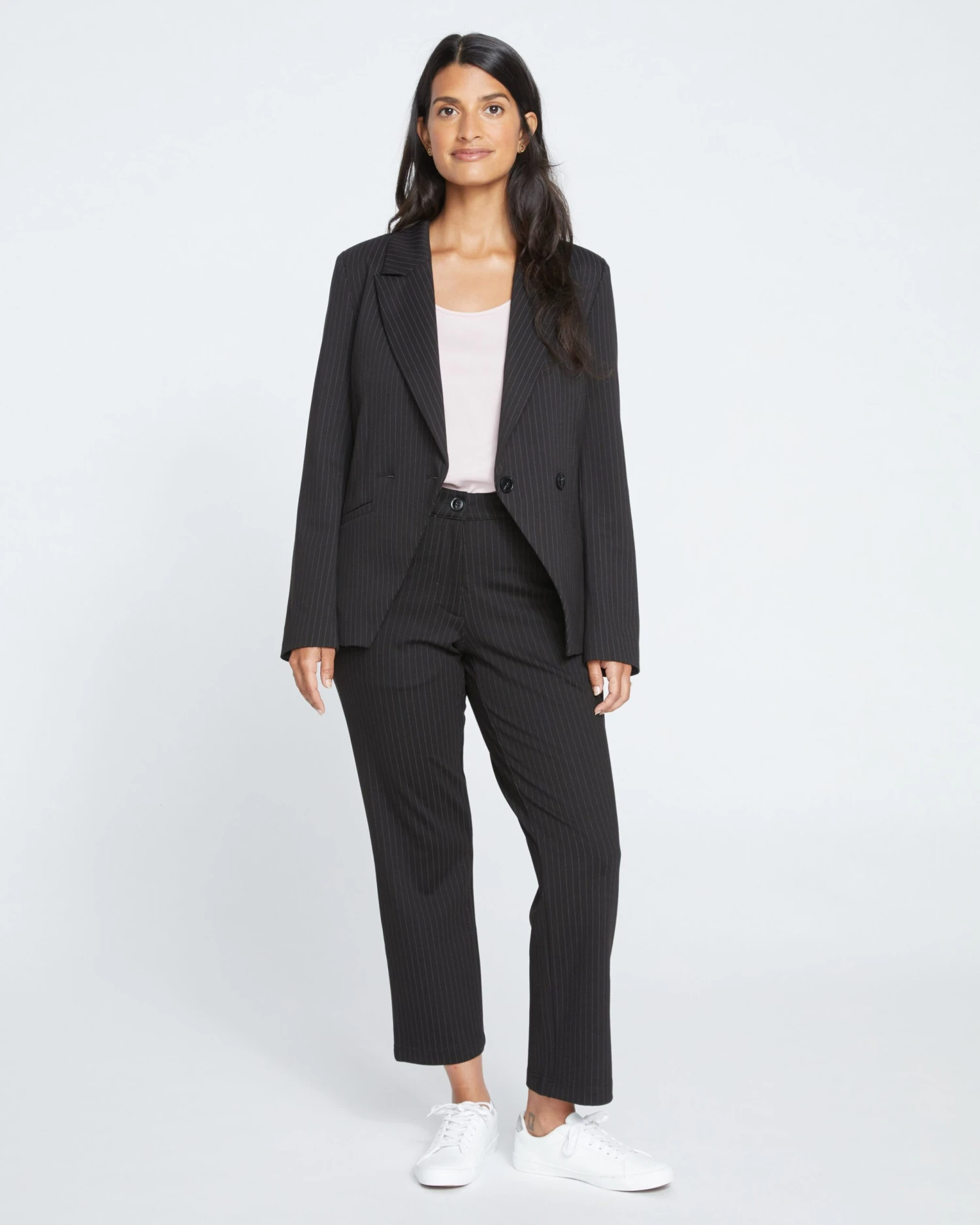 Modern meets of the moment. This double-breasted blazer is essential. The soft and stretchy feel balances the structured look—it’s made from our premium mid-weight Ponte fabric that everyone loves for its comfort and versatility. The proportions were perfected to suit many body types, and allow you to easily wear this jacket open or closed. If you’re looking for a curvy fit, this silhouette features princess seams and the most waist suppression of all our blazers. At the same time, the bracelet sleeves make this a petite-friendly style and the elongated back vent makes it comfortable for many different body types. Half lined. Lined through the front and sleeves with butterfly lining at the back.