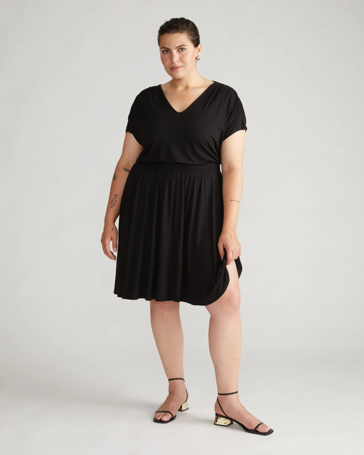 - Silky Liquid Jersey Fabric: Crafted from a premium rayon-elastane blend that drapes elegantly for a high-end look and feel.