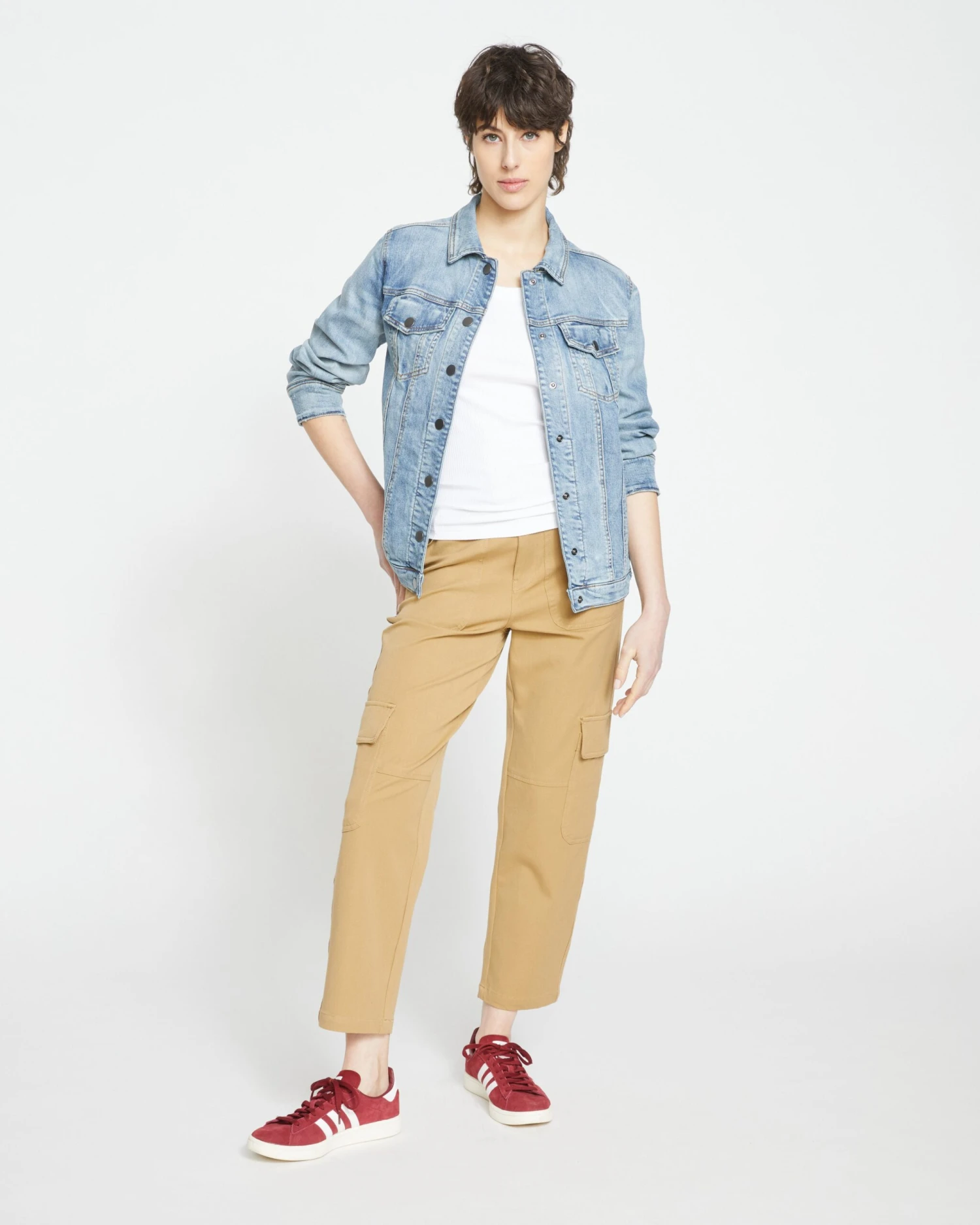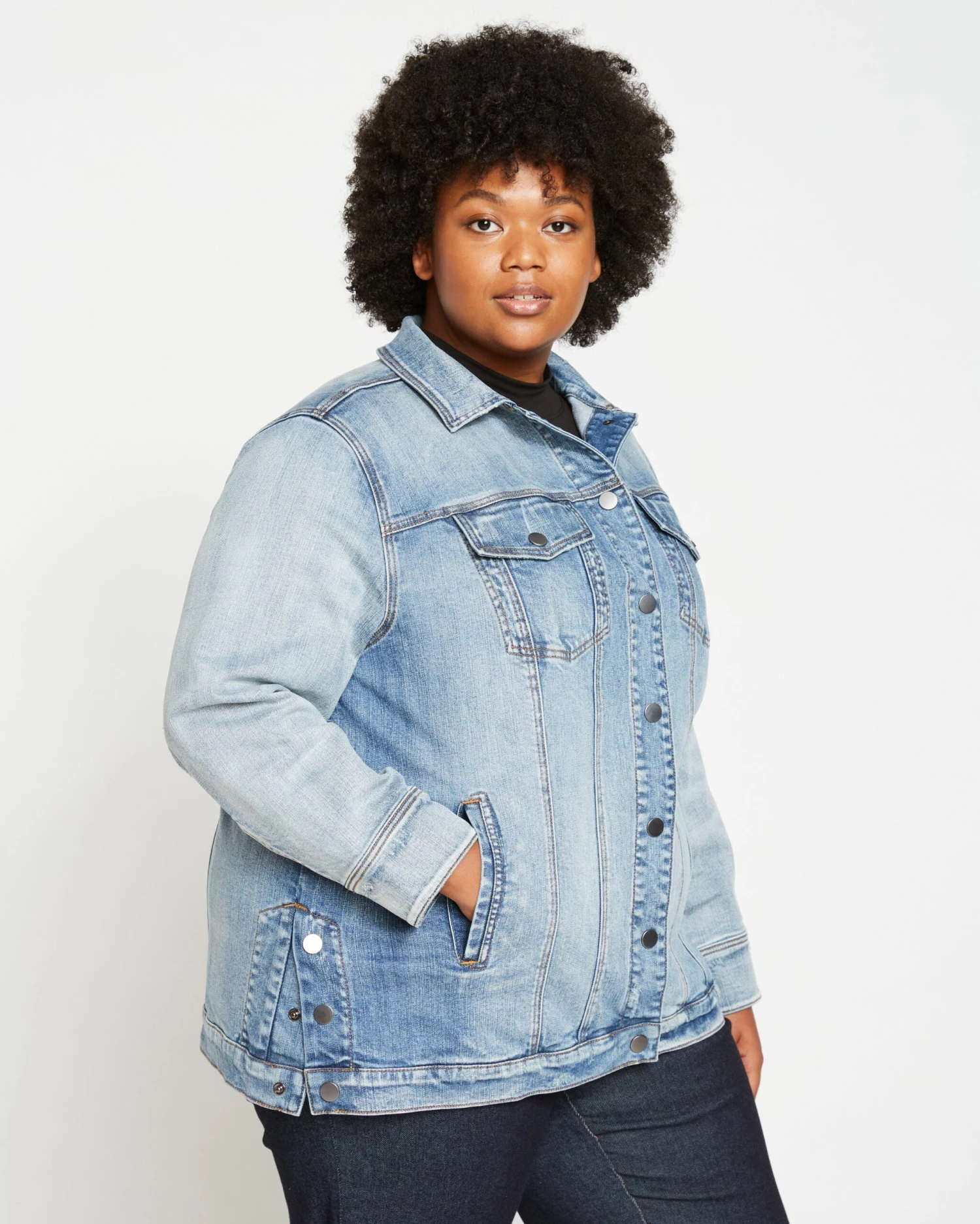 An ultra-cool longline denim jacket made from our signature stretch denim is here. Meet the Denim Chore Jacket. With a longer length that goes past the hips, and snaps on the side that allow you to open or close depending on your preference, this jacket is very versatile. The Denim Chore Jacket has plenty of pockets – at the chest and hips – so you can go hands free. Utilitarian ease and modern style come together in this jacket. Perfect to layer with now and later.