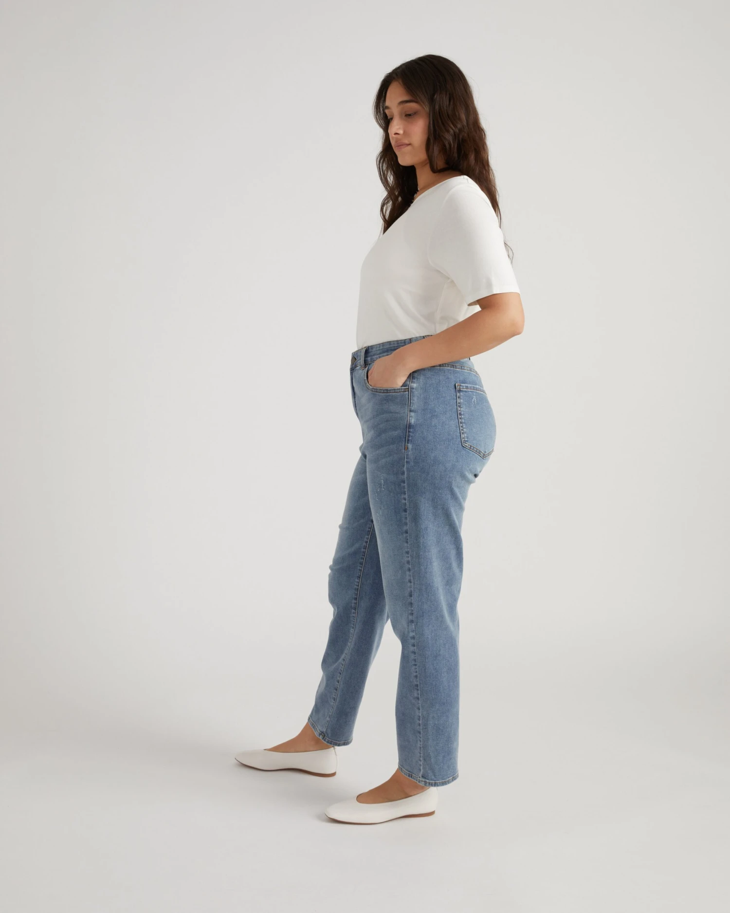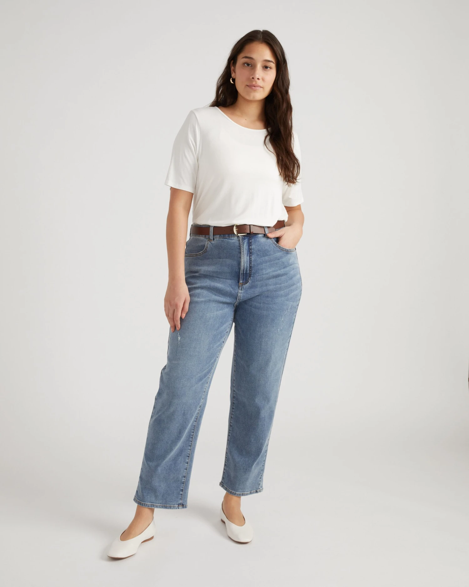 Meet the Ella Jeans. The silhouette of our beloved Etta in the fabric of our best-selling Seine. Vintage meets modern in this 90’s-inspired silhouette. Constructed specifically for those who have less than a 10″ waist-to-hip difference, the Ella has a subtle elastic waist and true straight fit through the hip and leg. The look is polished and clean but the feeling is “ahhhh” thanks to our comfy and stretchy denim fabric.
