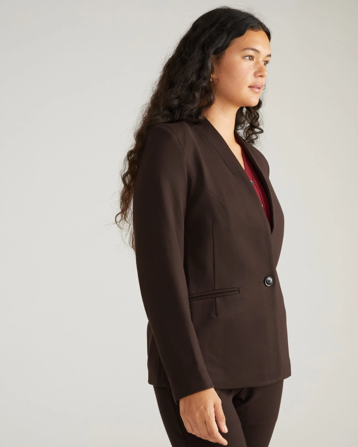 Elegant, refined, timeless. This collarless blazer is sharp without being overwhelming, thanks to the very slight shoulder pads. The soft and stretchy feel balances the structured look—it’s made from our premium mid-weight Ponte fabric that everyone loves for its comfort and versatility. The proportions were perfected to suit many body types, and allow you to easily wear this jacket open or closed. Plus, the elongated back vent makes it comfortable for all. Half lined. Lined through the front and sleeves with butterfly lining at the back.