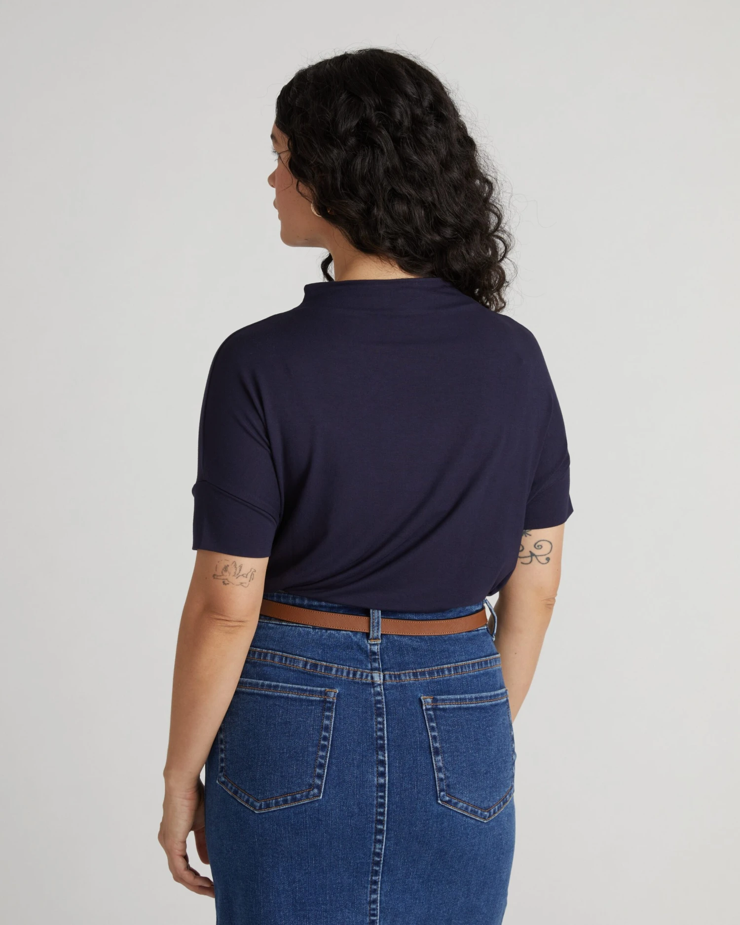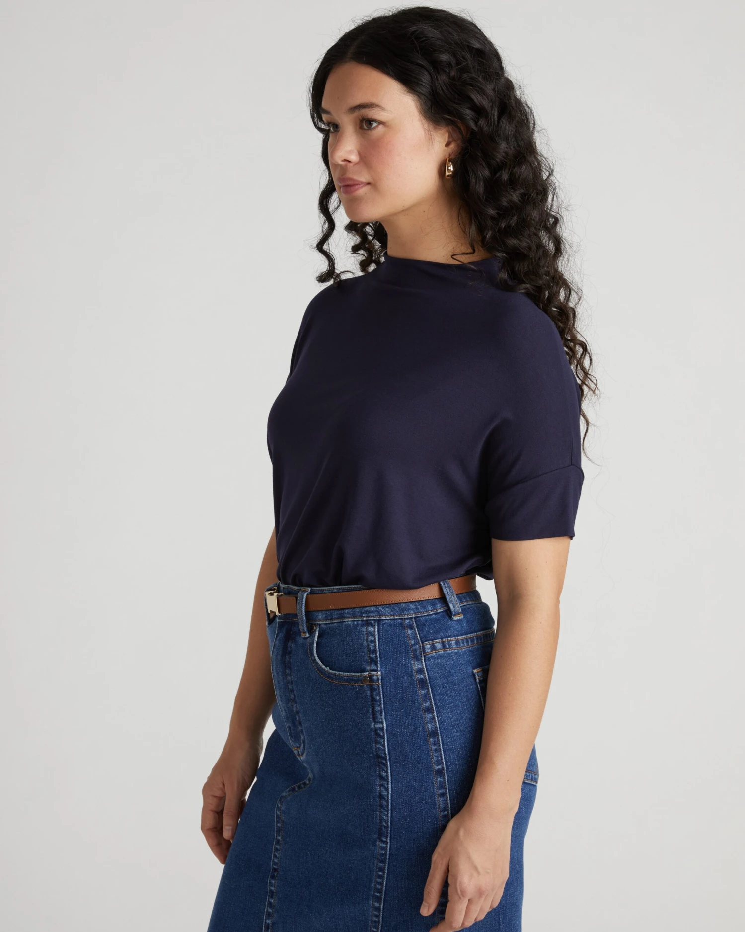 Experience the perfect blend of sculptural design and luxurious comfort with the Petra Liquid Jersey Top. Featuring clean lines and a sophisticated high mock neck, this piece is crafted from premium stretch jersey that caresses the skin while offering a powerful, sharp silhouette. Whether you are dressing for a high-stakes meeting or an effortless evening out, this top provides a non-clingy, flattering fit that moves with you.