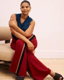Stephanie Wide Leg Stripe Ponte Pants 30 Inch – Black Cherry With Green/Ultramarine Piping