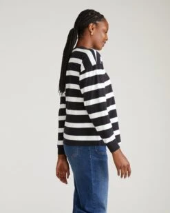 Relaxed Long Sleeve Striped Tee in Black/White with Aqua Edge