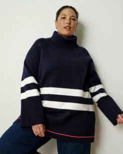 Oversized Striped Turtleneck Sweater – Soft Non-Scratchy Navy Knit