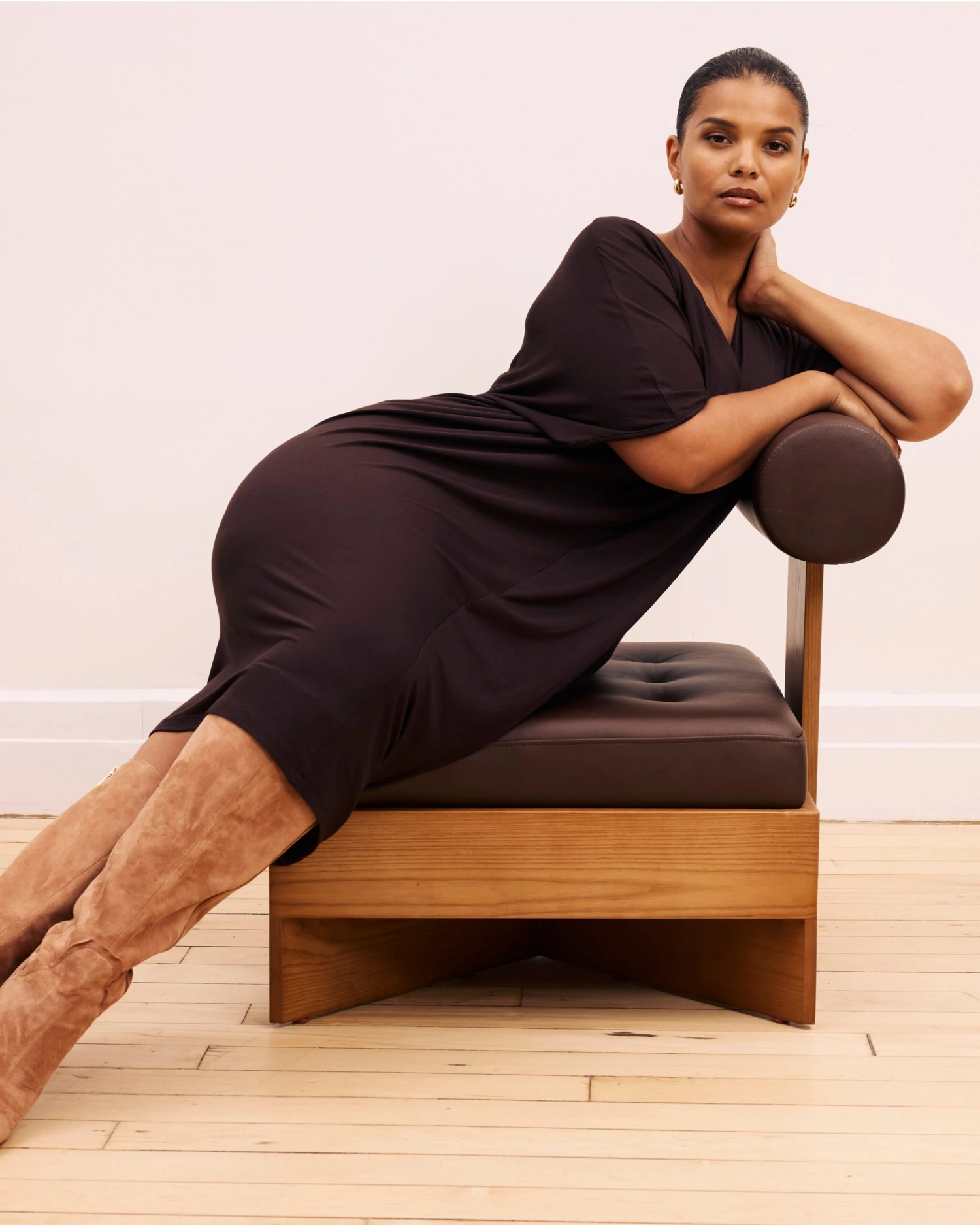 Elevate your seasonal wardrobe with the Teresa Espresso Liquid Jersey V-Neck Dress. Designed to bridge the gap between high-fashion aesthetics and everyday comfort, this piece offers a fluid silhouette that transitions effortlessly from the boardroom to an evening gala. Crafted from our signature ultra-smooth liquid jersey, it provides a luxurious feel and a wrinkle-resistant finish that keeps you looking impeccable all day long.