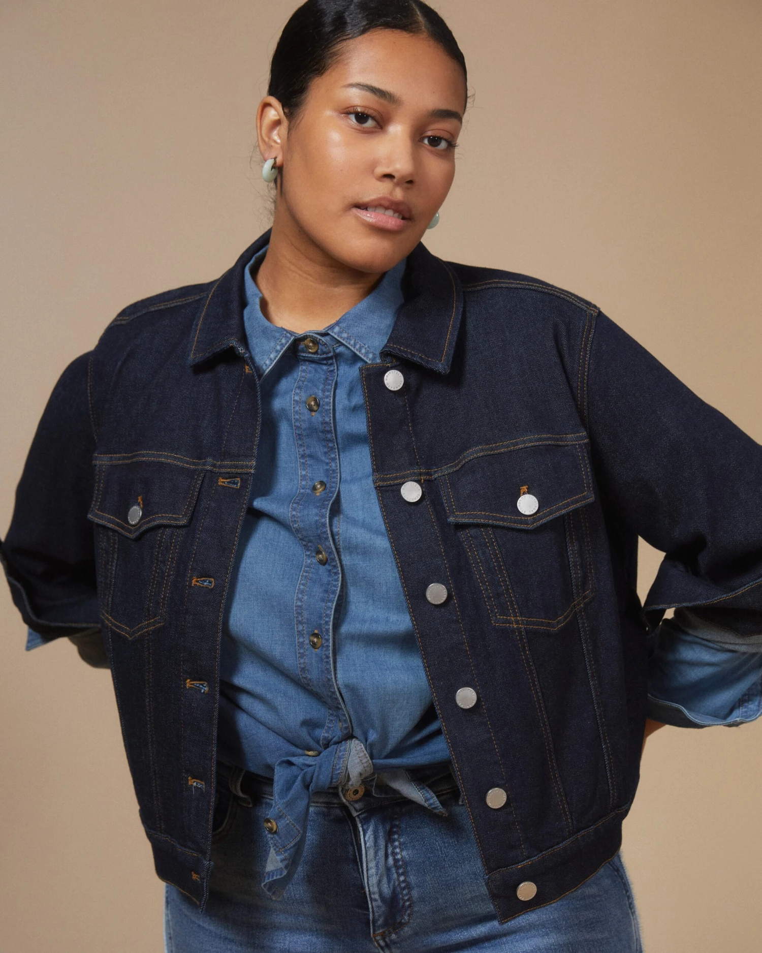 - Style: Lightweight layering piece with contrast stitching