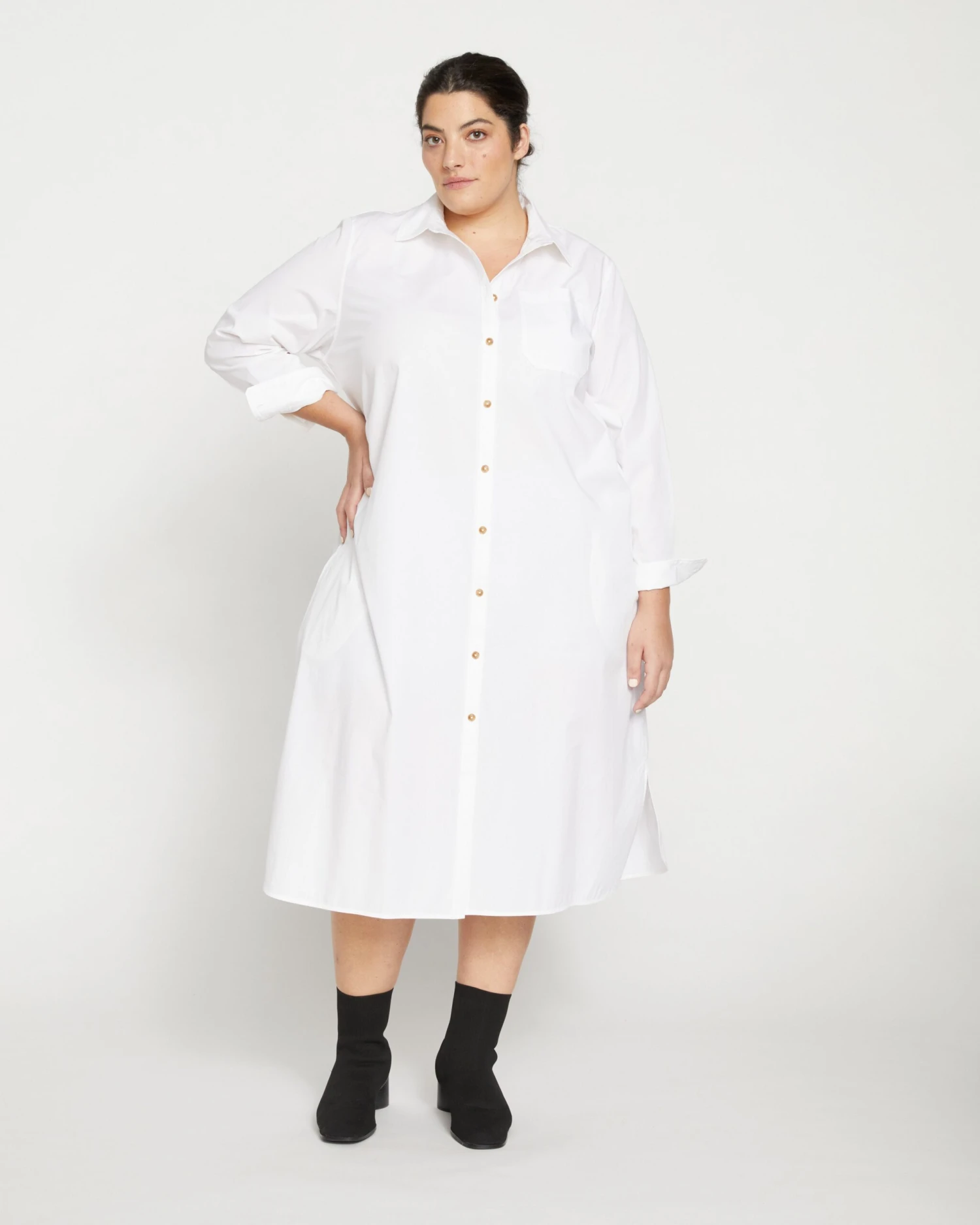 - Chic Contrast Buttons: The full-length front placket is accented with stylish buttons that elevate the minimalist white design.